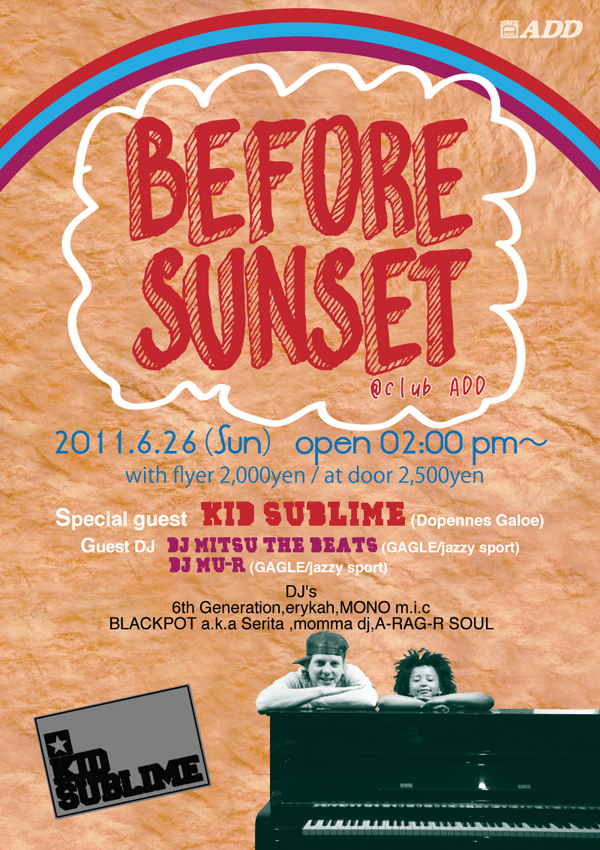 Kid Sublime をスペシャルゲストに迎えたデイタイムイベント【BEFORE SUNSET】が、今週日曜にADDにて開催されます。