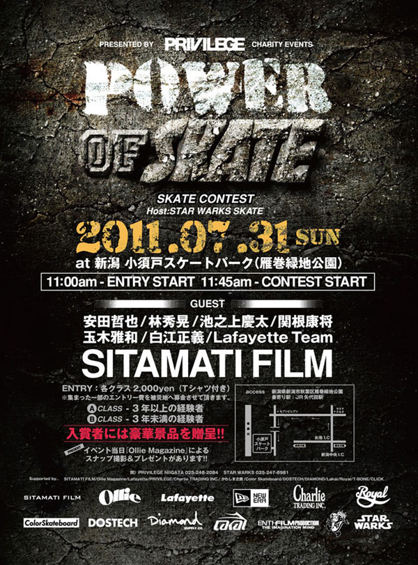 協賛/STUSSY、CHARLIE TRADING、Lafayette、かわしま企画、Colorskateboard、DOSTECH、Diamond、Lakai、Royal、Diamond、Lakai、Royal