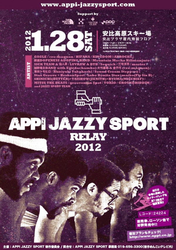 イベントは、人種、言語、文化、経済、政治、宗教、すべての垣根を越えた世界の共通語です。中でも「音楽」と「スポーツ」は、 特に人気のある2大テーマです。この2つが同時に楽しめる空間、高い水準でコラボレーションできる空間の創出は、「計り知れない可能性」 を秘めています。私たちの目指すイベントは昨今、その本質が問われだしている、劣悪な環境下での野外イベントではありません。 柔軟な思考と、しなやかな筋肉をもった「アスリート」のように、新しい枠組みを視座に入れた、音楽とスポーツの心地よい並走を目指しています。 text by appi-jazzysport.com日時:2012年1月28日(土)