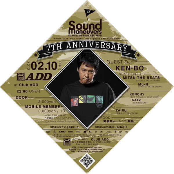 GAGLEのDJ Mu-R,DJ MITSU THE BEATSによるイベント”SOUND MANEUVERS”が、2月で7周年となり、ゲストにDJ KEN-BOを迎え開催されます。