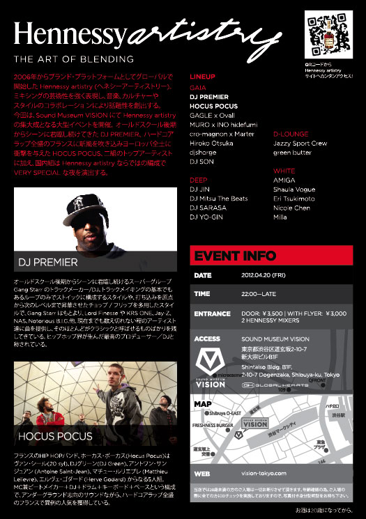 2006年からブランド・プラットフォームとしてグローバルで開始したHennessy artistry (ヘネシーアーティストリー)。ミキシングの芸術性を 強く表現し、音楽、カルチャーやスタイルのコラボレーションにより話題性を創出する。今回は、Sound Museum VISION にてHennessy artistryの集大成となる大型イベントを開催。 オールドスクール後期からシーンに君臨し続けてきたDJ PREMIER、ハードコアラップ全盛のフランスに新風を吹き込みヨーロッパ全土に衝撃を与えたHOCUS POCUS、2組のトップアーティストに加え、国内組はHennessy artistryならではの編成でVERY SPECIALな夜を演出する。