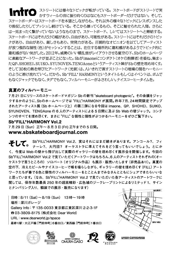 スケートボードカルチャー誌、Sb skateboard journalと6人のアーティストによるweb上、またその後に実際のギャラリーで行う展示企画”Sb”FILL”HARMONY Vol.2″が、今週末より動き出します。