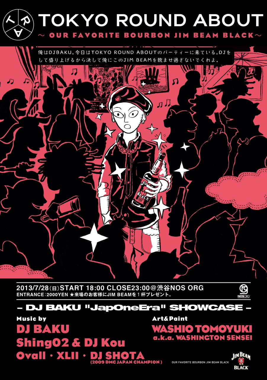 しかしこの神イベント<TOKYO ROUND ABOUT>はそれだけでは終わらない。何とイラストレーション、グラフィックデザインの世界を中心に独特の世界観を描き続け、『JapOneEra』にも封入されているDJBAKUの自伝漫画を華麗に描写したWASHIO TOMOYUKIがライブペイントを披露する! しかもライブペイントのみならず会場となる渋谷NOS ORGではその後、1カ月に渡って作品展示も行われる!