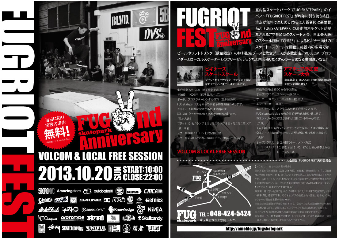 2011年10月に埼玉県志木市にオープンした室内型スケートパーク『FUG SKATEPARK』の2周年を記念した施設使用料無料イベント『FUGRIOT FEST』が10月20日(日)に開催されます。