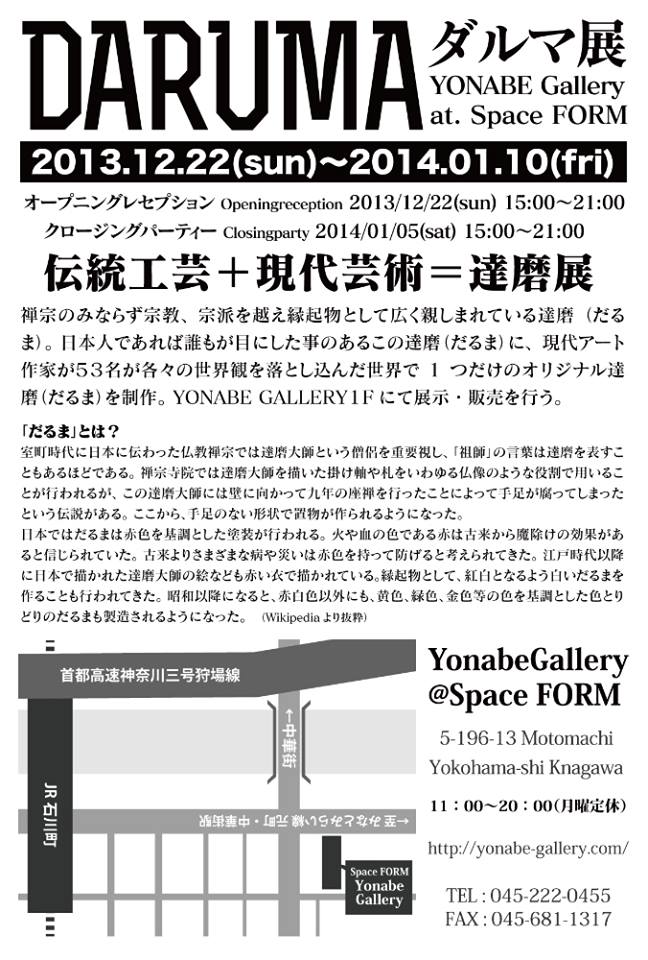 伝統工芸+現代芸術=達磨展。 禅宗のみならず宗教、宗派を越え縁起物として広く親しまれている達磨(だるま)。日本人であれば誰もが目にした事のあるこの達磨(だるま)に、作家53名が各々の世界観を落とし込んだ世界で1つだけのオリジナル達磨の展覧会が開催。