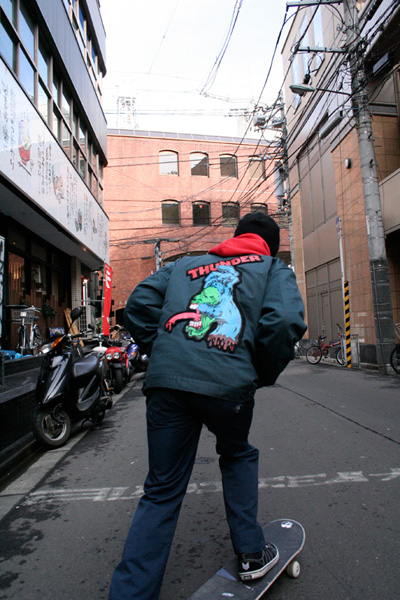 M 東海岸は一回行ってみたいかな。リッキー・オヨラって俺が高校の時にスーパーカリスマだったフィアデルフィアのスケーターがいるんだけど、そいつが始めたTrafficっていうスケボーチームっていうかカンパニーがあって、そこにカメラマンやりながらプロライダーやってるリッチ・アドラーって奴が、去年の暮れに東京に撮影に来てたんだけど、そん時ちょうど友達のつてで一緒に滑んない?って言われて行った時に初めて東海岸のやつと友達になって、もう全然違くて西海岸のやつと。同じアメリカでも西と東でこんなに違うんだ!って思うくらい。