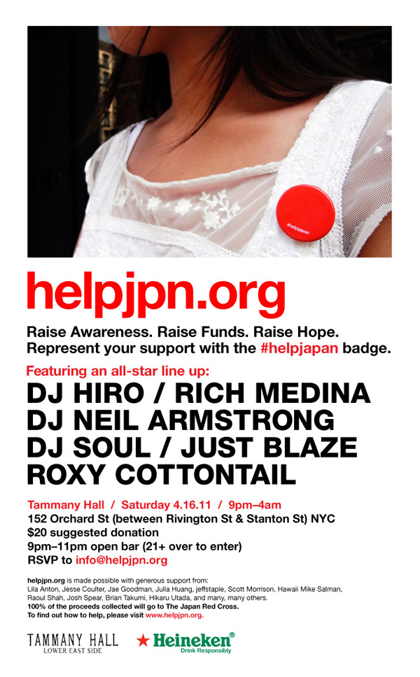 寄付した人やサポートした人は誰でももらえます。援助した証だけでなく、呼びかけのバッジでもある。2011年4月16日、ニューヨークでみんなが集まり、日本赤十字に直接寄付して、このパッジを付けてもらうイベントを企画しています。商品を買わなくていい。「収益の何%」とか何もない...支援した人たちが周りの人に、同じように手を差し伸べるよう呼びかける方法を示すだけ。With the help of our friends, we’ve amassed an incredible all-star line up of DJs to provide you with what will be a very special night. Please come out and support, have a good time and GIVE. Japan has given us so much. It’s time to give back.