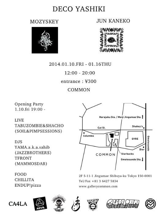2014年1月10日(金)から1月16日(木)の間、原宿COMMONにて、MOZYSKEYとJUN KANEKOによる2人展”DECO YASHIKI”が開催される。